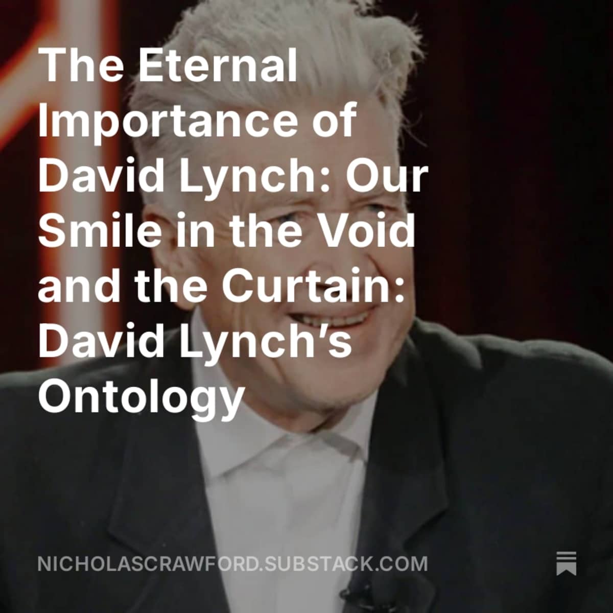 I don’t believe that any artist has ever engaged so directly with ontology and subjectivity’s role in it as David Lynch. And the stunning fact is that he did so without the aid of philosophy or psychoanalysis; his preciousness cannot be overstated...